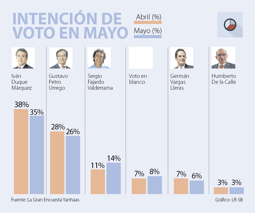 La incertidumbre también ganó terreno a menos de dos semanas de las votaciones. La intención del voto en blanco se alzó del 7% al 8% y quienes no saben o no responden pasaron de 4% en abril a 7% en mayo. Por otro lado, Germán Vargas Lleras perdió 1% de la intención de voto quedando en 6%, mientras que Humberto De la Calle se mantuvo en 3%.