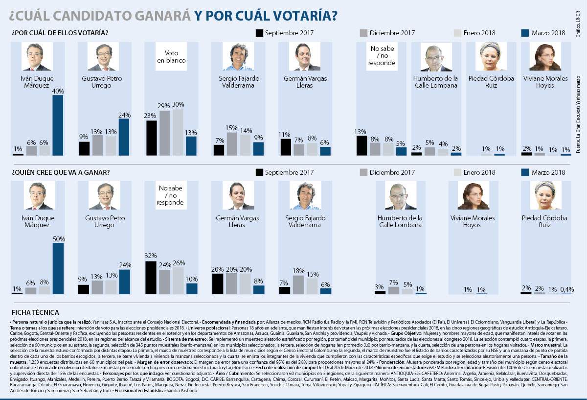 De acuerdo con los más recientes resultados de la Gran Encuesta Yanhaas, realizada para la gran alianza de medios, quienes lideran en intención de voto son Iván Duque, Gustavo Petro y Sergio Fajardo. Sin embargo, es el candidato del Centro Democrático, Iván Duque, por quién votarían 4 de cada 10 colombianos si las votaciones fueran mañana.