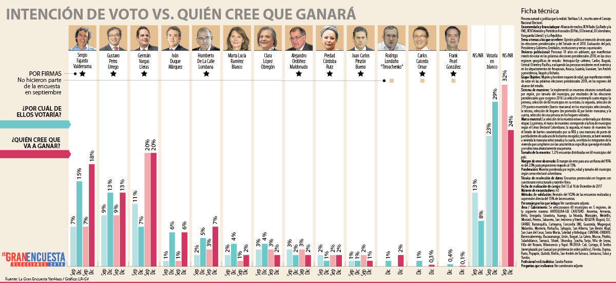 El cierre del año que antecede la contienda electoral por la Presidencia es determinante en la carrera por la Casa de Nariño, pues los jefes de campaña analizan los resultados para mover las fichas a su favor. De acuerdo con la última La Gran Encuesta de YanHaas, el candidato que cierra 2017 con mayor intención de voto es el representante de la Coalición Colombia, Sergio Fajardo, con 15% de favorabilidad entre los votantes.