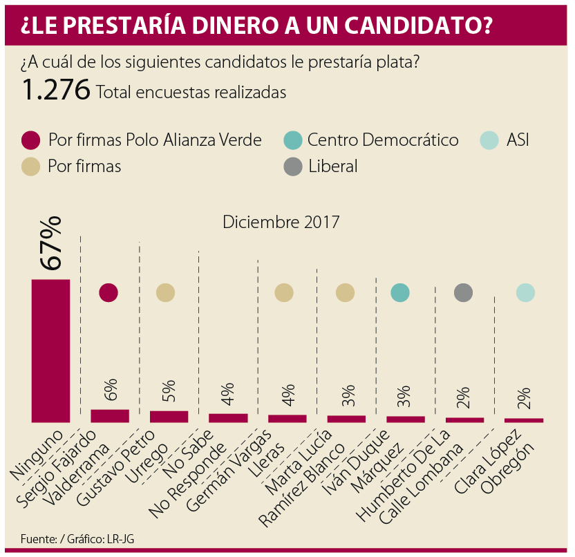 Con el fin de medir esos indicadores de confianza, La Gran Encuesta le preguntó por primera vez a los colombianos ¿a qué candidato le prestaría plata?. Una pregunta a la que 67 de cada 100 encuestados respondieron negativamente.