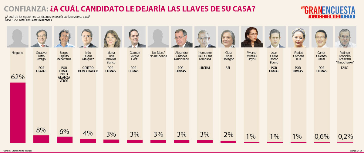 Los resultados más recientes de La Gran Encuesta YanHaas, que realiza la alianza de medios integrada por RCN Radio, La F.M., RCN Televisión, El País, El Universal, El Colombiano, Vanguardia Liberal y La República, reveló que, ante la pregunta, ¿a cuál candidato le dejaría las llaves de su casa? 62% de los colombianos respondió que a ninguno.