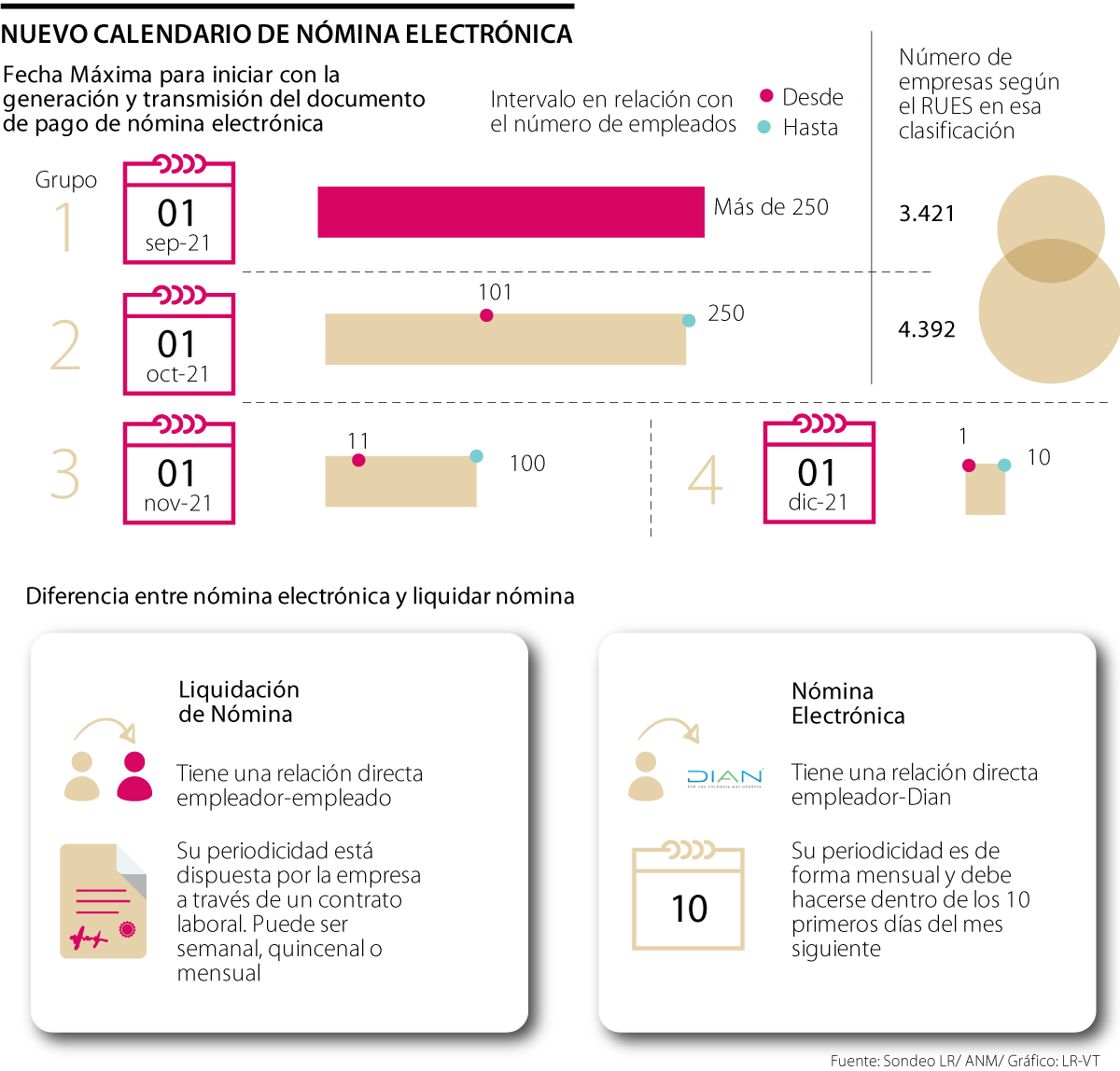 Las primeras tienen un máximo para iniciar con la generación y transmisión del documento el 1 de septiembre. Acá según el Rues, son más de 3.421 compañías que tienen más de 250 empleados, y le seguirán el 1 de octubre de este año, 4.392 empresas con nóminas entre 101 y 250 personas.