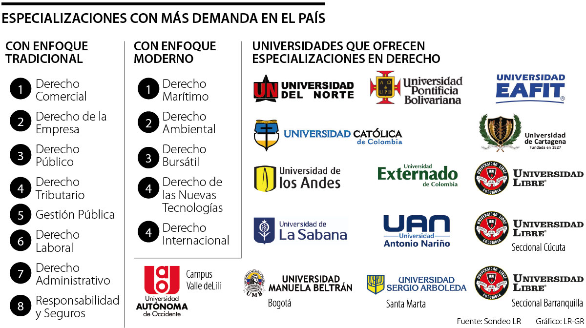 En este último punto, las universidades de Colombia han fortalecido la actual oferta académica ofreciendo posgrados con el objetivo de que un profesional pueda desempeñarse en campos como el derecho territorial y urbanístico, y otros tradicionales como el derecho penal, administrativo, tributario y constitucional. En el caso de la Universidad de Los Andes, esta reconoció las especializaciones en derecho comercial, derecho de la empresa, público, tributario y gestión pública como las más solicitadas de la institución.