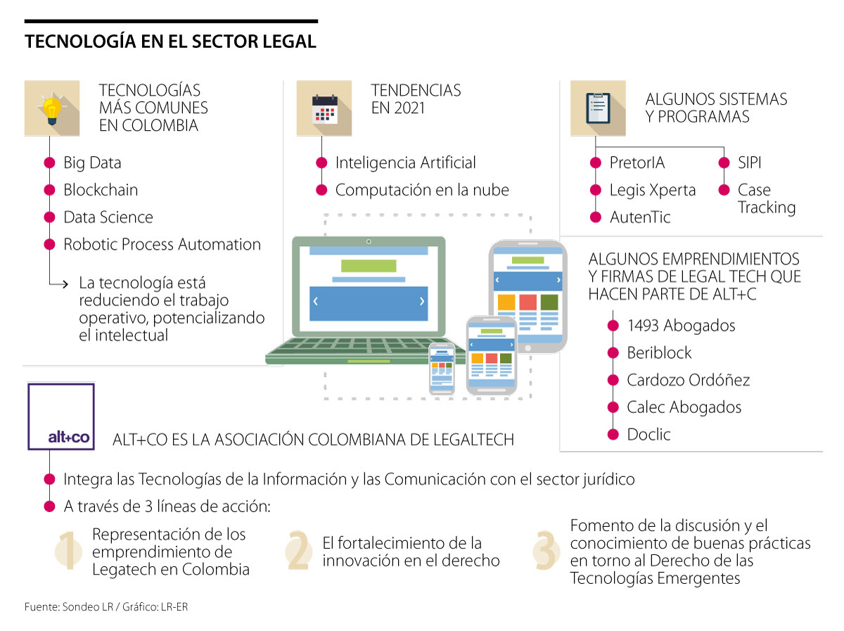 El especialista anotó que alrededor de las firmas de abogados, también se ha comenzado a incursionar en softwares como Legis Xperta, que facilitan la búsqueda de información jurídica, tributaria y contable, además de permitir el acceso a contenidos analizados por expertos, a la preparación de documentos legales y la automatización de respuestas.