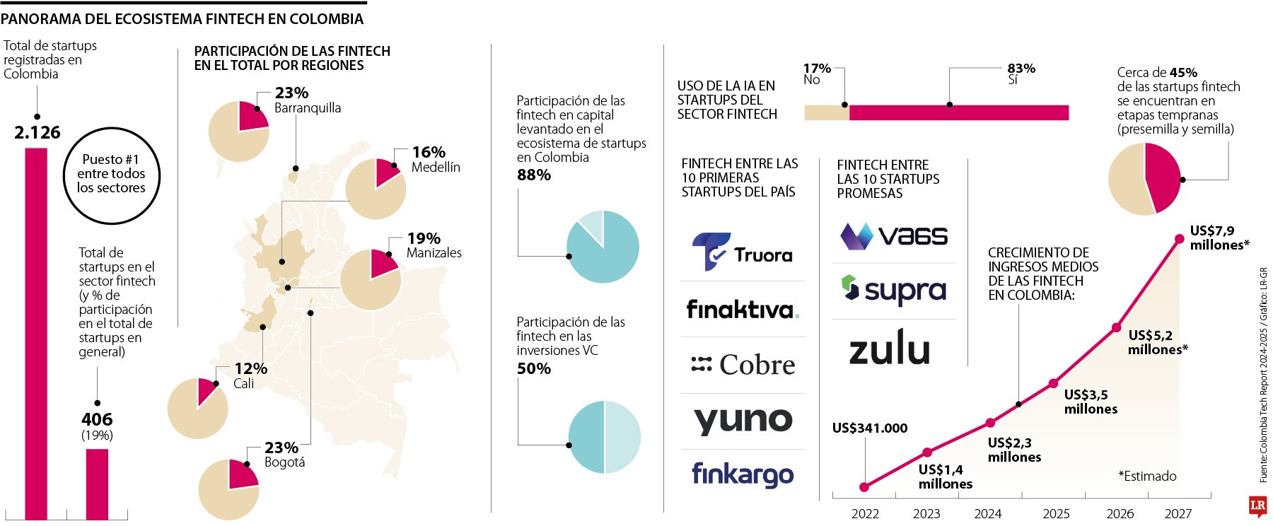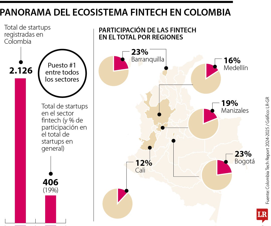 El ecosistema emprendedor en Colombia ha mantenido un crecimiento sólido y constante, dentro de él, las fintech se posicionan como el segmento de mayor participación, representando 19% de las startups que habían activas en el país para 2024, según el último informe de Colombia Tech Report 2024 - 2025. En cuanto a regiones, las fintech se encuentran 23% en Bogotá, 23% en Barranquilla, 19% en Manizales, 16% en Medellín y 12% en Cali.