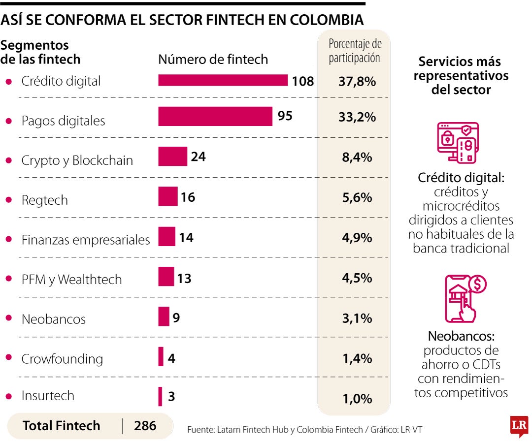 Según un sondeo, en el país hay 108 fintech enfocadas en créditos digitales y 95 en pagos. Los neobancos, aunque pocos, ganan relevancia con cuentas de ahorro y CDTs