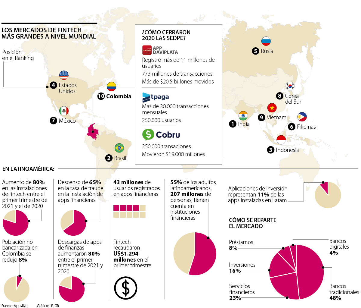 Según un informe de AppsFlyer para Latam, la población no bancarizada cayó 8% en Colombia; 18% en México, y 73% en Brasil