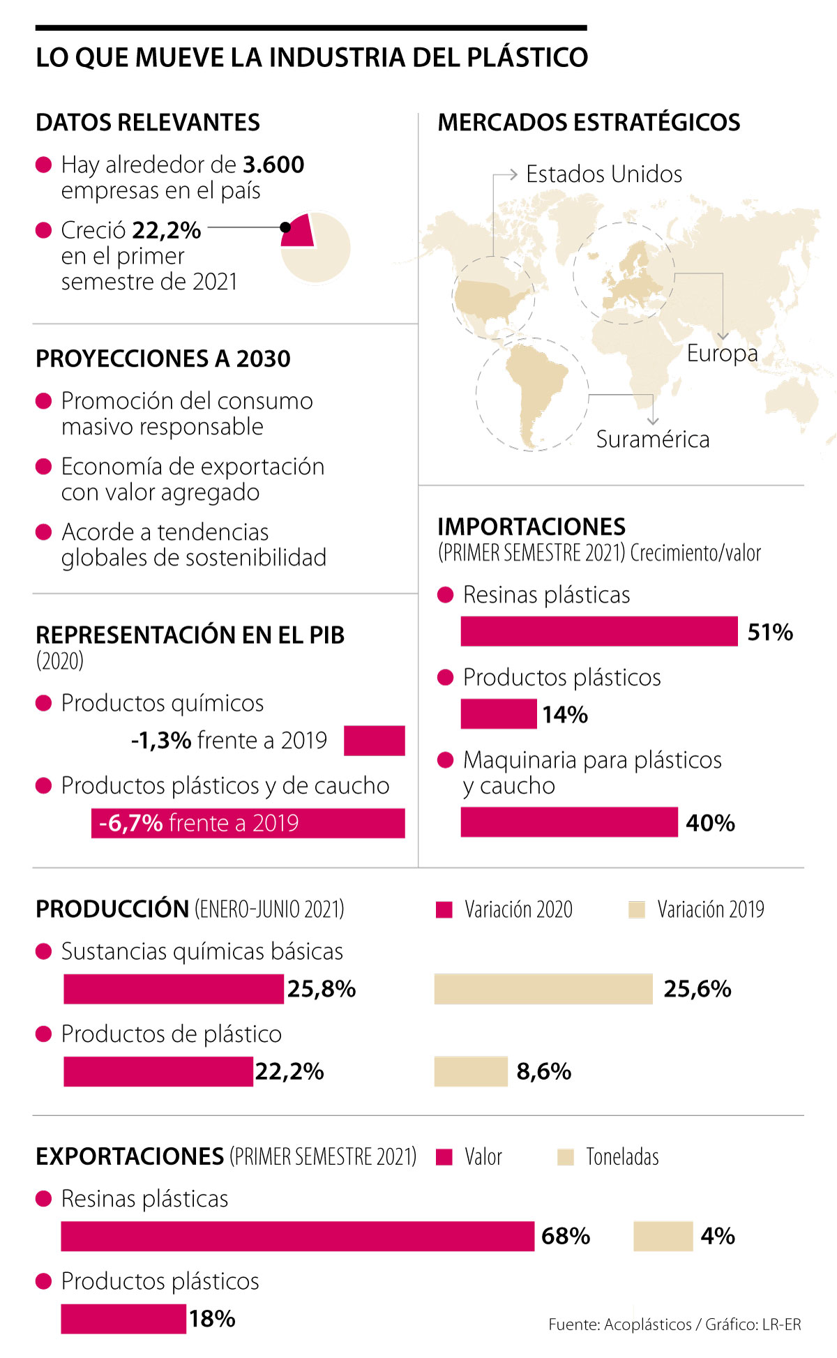 Según Acoplástico, de la producción local de materias plásticas, más de la mitad tiene como destino los mercados externos. En 2020, 56% del tonelaje total corresponde a la exportación directa de resinas y el porcentaje restante se transformó en el país, en semiproductos y manufacturas, intermedios y de consumo final, los cuales a su vez, se venden en el mercado doméstico, y se exportan también a otros países.