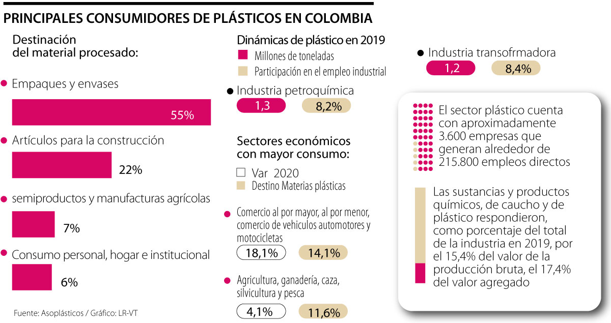 Adicionalmente, se conoció que los dos principales sectores económicos en Colombia con mayor participación en el consumo de plásticos están relacionados con el comercio, al por mayor y al por menor, con 14,1% de facturación y, a la agricultura, la ganadería, la caza y la silvicultura cuyo registro alcanza 11,6% del total en el país. Ambos con un alentador crecimiento de 18,1% y 4,1% respectivamente, con base al año anterior.