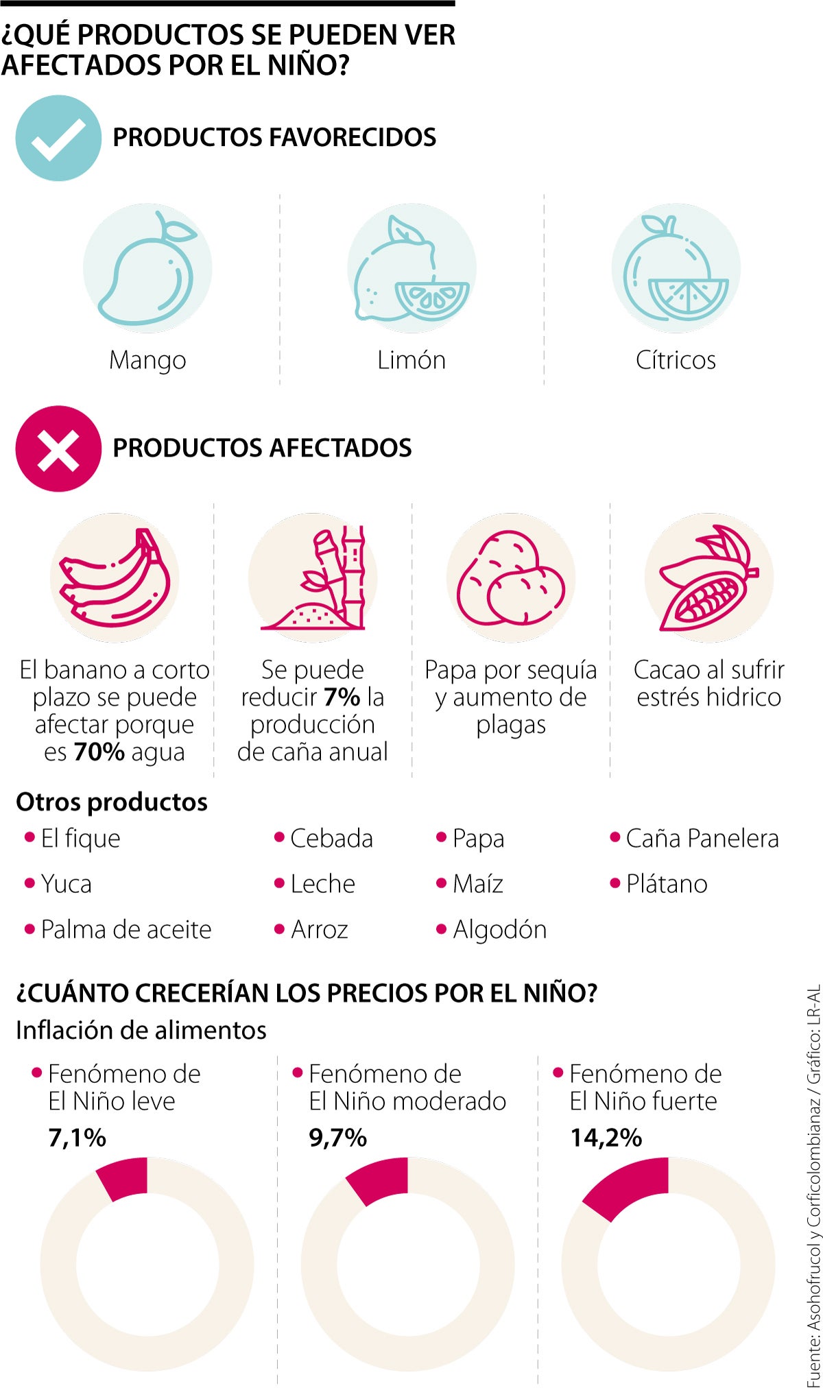 Corficolombiana advirtió el mes pasado que la inflación en los alimentos estaría estrechamente ligada a la intensidad que llegase a tener este fenómeno. Si El Niño es leve, la inflación estaría cercana a 7,1%; en caso de ser moderada, llegaría a 9,7%, pero si se torna intenso, los aumentos podrían llegar hasta 14,2%.