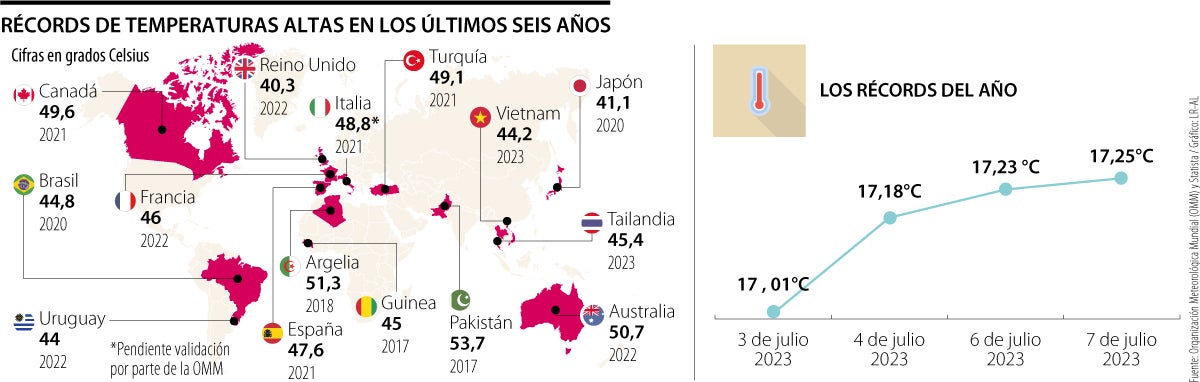 La OMM calcula que este mes estará aproximadamente 1,5 grados Celsius por encima de la media preindustrial. El Niño podría llevar la temperatura a máximos históricos en diferentes partes del mundo