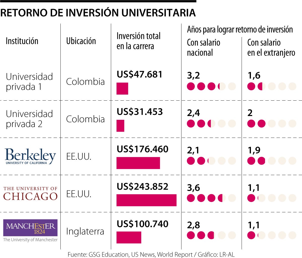 Con información del Observatorio Laboral para la Educación (OLE) de MinEducación y datos de las universidades, GSG Education señala que mientras los egresados de universidades como la Berkeley en EE.UU. podrán recuperar una inversión de US$176.46 en un tiempo promedio de un año y nueve meses, un graduado de una universidad privada nacional, tardará en promedio dos años y cuatro meses en recuperar una inversión de US$31.453 al emplearse en el país.