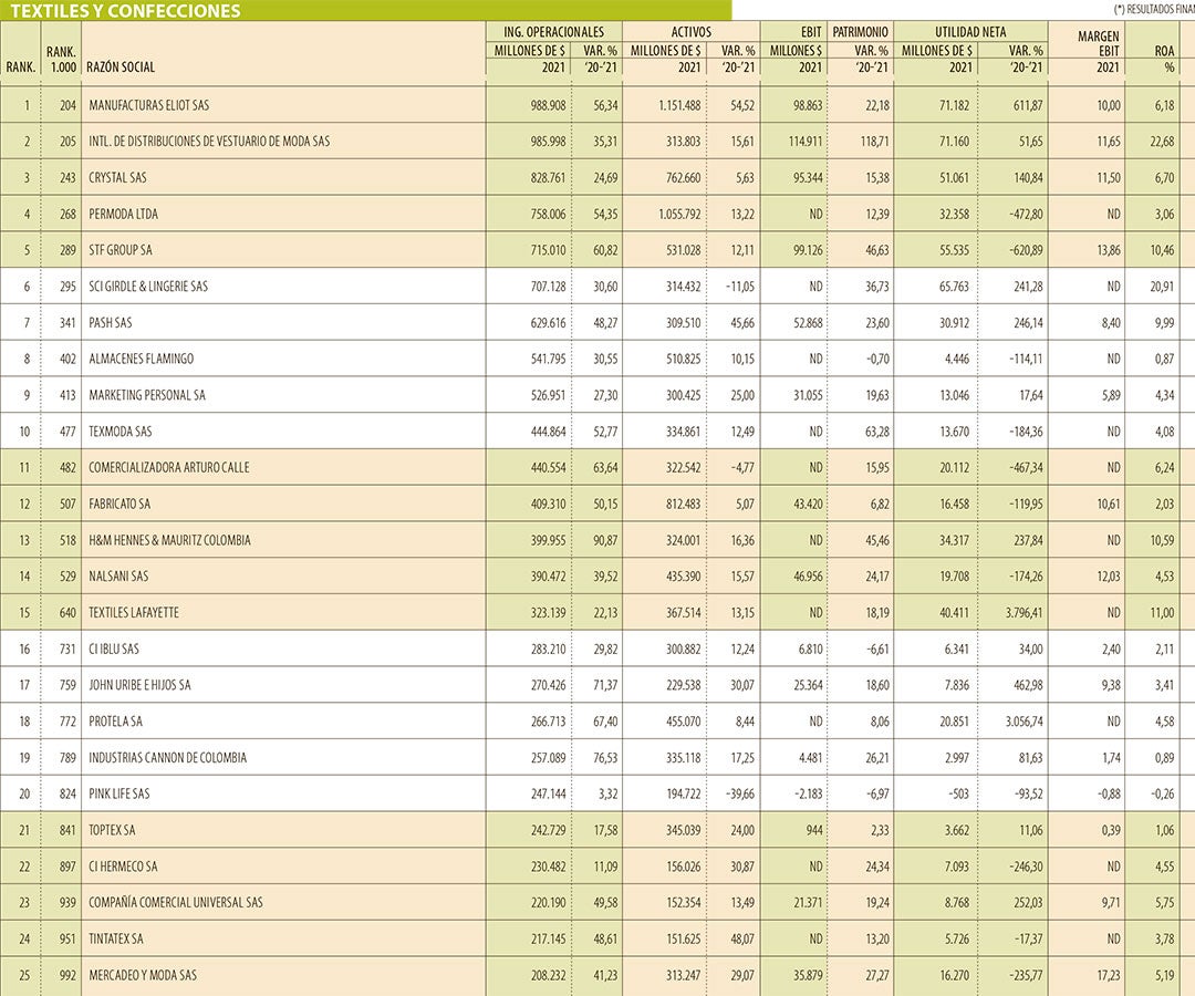 De las 1.000 empresas más grandes que reportan a la Superintendencia de Sociedades en su informe de 2021, 25 son del sector de textiles y confecciones, de acuerdo con el reporte presentado por la entidad. Estas empresas lograron registrar $11,5 billones de ingresos en 2021.