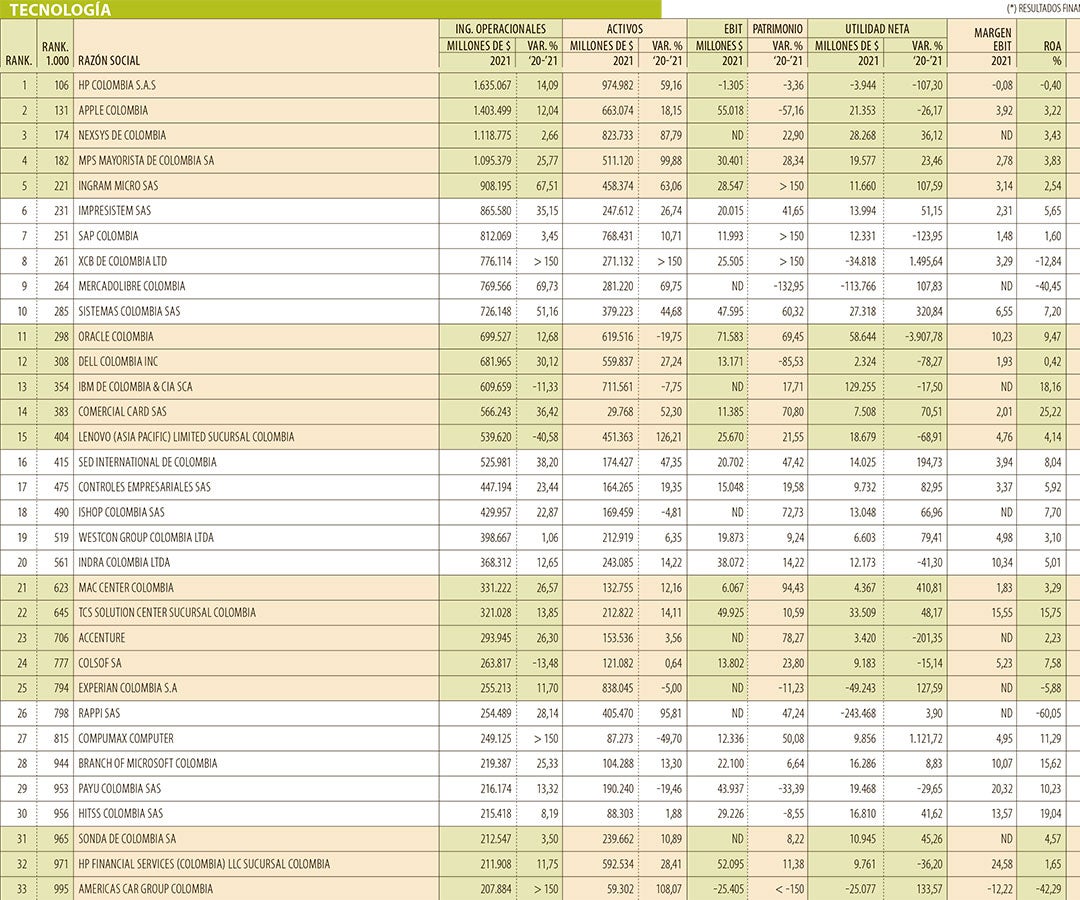 Tras el final de las restricciones generadas por el covid-19, los servicios de tecnología y de teletrabajo vieron engrosados motores de recaudo. De acuerdo con el informe de la Superintendencia de Sociedades, HP Colombia encabezó el listados de las empresas con más ventas en el sector. El gigante de las tecnologías logró mantener el primer escalón por medio de las venta de computadores y diversos equipos para la transmisión de contenidos.
