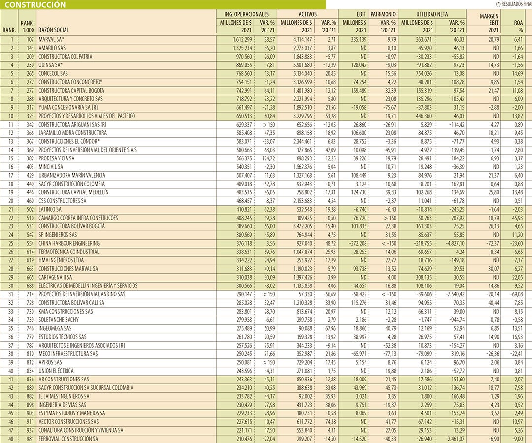 Por ingresos operacionales de las empresas, las de construcción tienen 2,2% del total y lograron una variación de 15,2% frente al año anterior. De esta forma volvieron a la cifra de 2019, ya que en 2020 registraron $17,7 billones. Las empresas que lideran el top cinco son: Marval, Amarilo, Constructora Colpatria, Odinsa y Concecol.