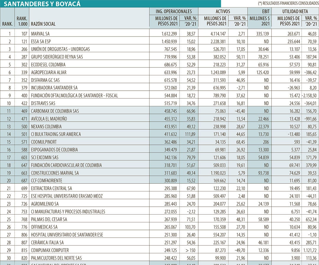 Un total de 42 compañías de los departamentos de Santander, Norte de Santander y Boyacá clasificaron al listado de las 1.000 más vendedoras de 2021, sin embargo, ninguna de las empresas de estas regiones alcanzaron a entrar al top 100.