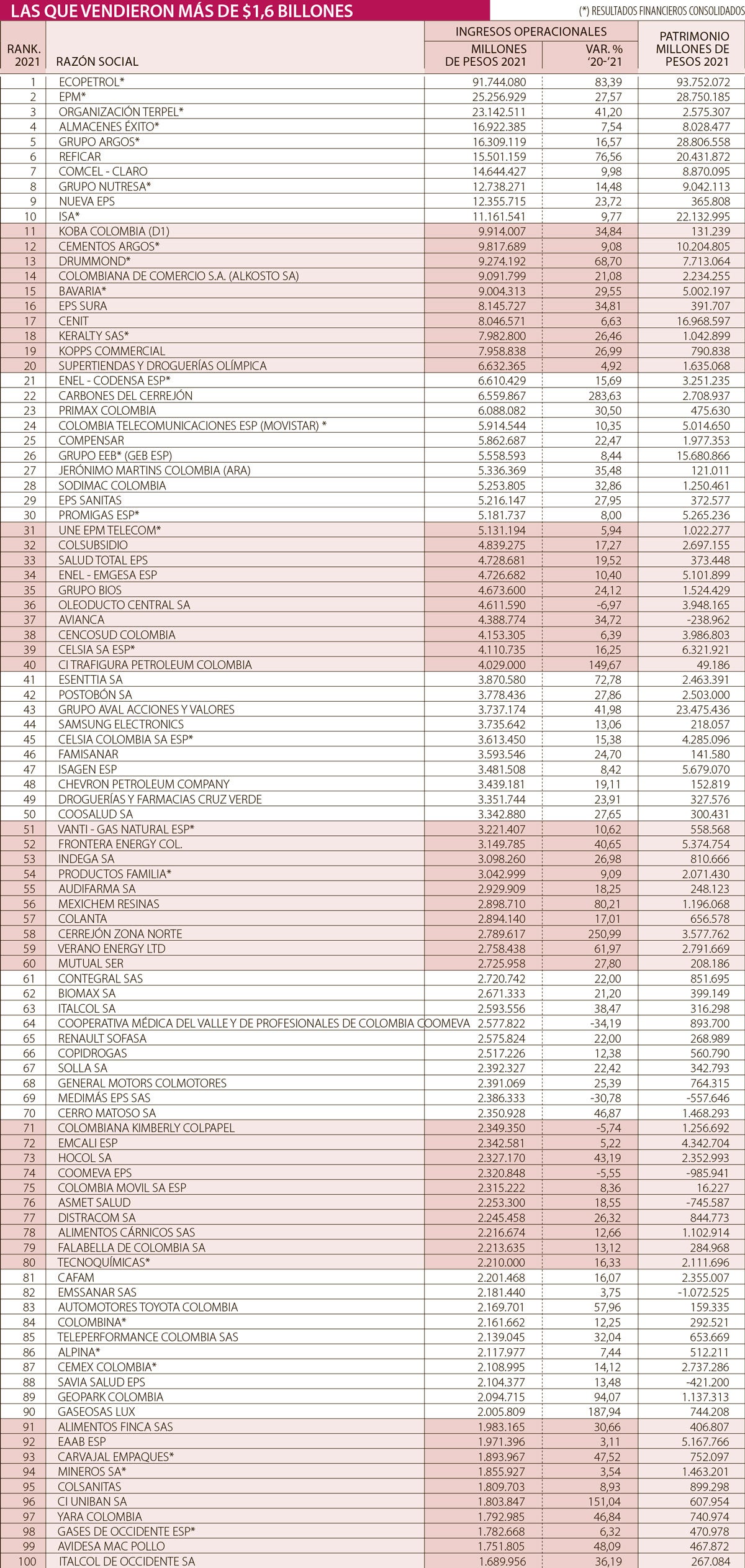 En el top 5 la que más aumentó las ventas fue Ecopetrol, cuyos ingresos operacionales crecieron 83,39%. Le sigue Organización Terpel, cuyas ventas aumentaron 41,2% hasta los $23,1 billones. Luego está EPM que tuvo un incremento en sus ingresos operacionales de 27,57% llegando a los $25,2 billones.
