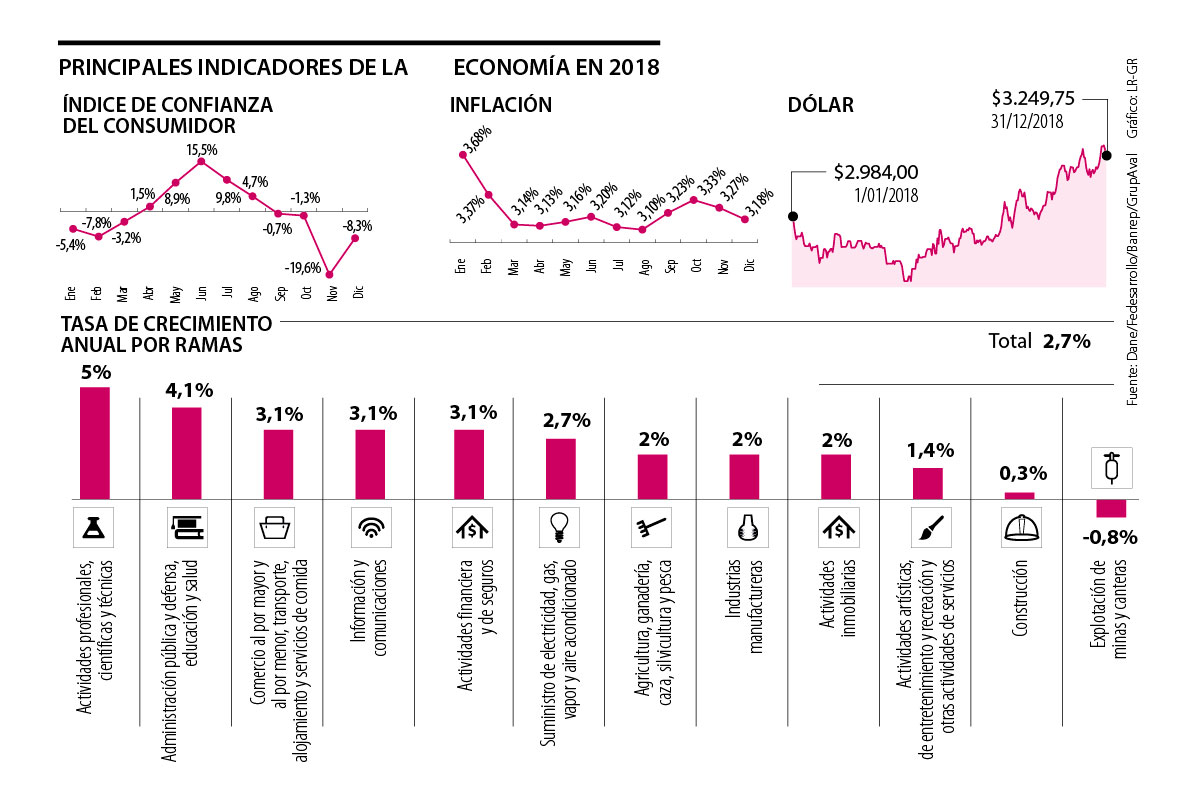 Por su parte, el suministro de electricidad, gas, vapor y aire acondicionado creció 2,7%. Y el rubro de la agricultura, ganadería, caza, silvicultura y pesca se expandió 2%, una cifra inferior al dato de 5,5% de 2017. Este mismo crecimiento de 2,2% lo reportaron tanto las actividades inmobiliarias como la industria manufacturera que un año antes había caído 1,8%.