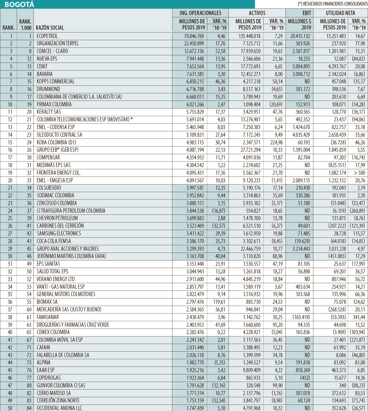 Ecopetrol, Terpel y Claro siguieron liderando un año más las ventas totales de las compañías de Bogotá y Cundinamarca