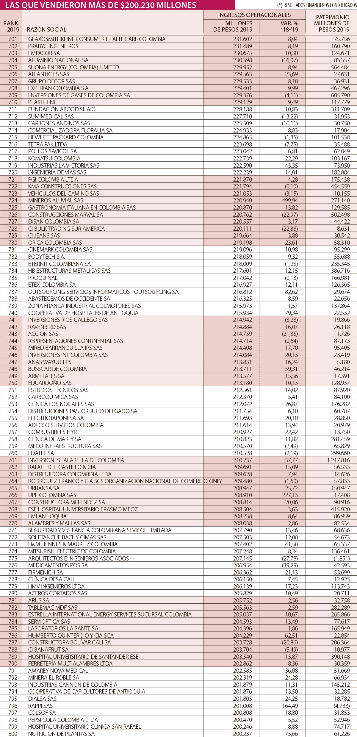 Las empresas en el grupo de las 800 totalizaron en 2019 ingresos por $21,39 billones, lo que quiere decir que aportaron 2,4% del total de los ingresos de las 1.000 empresas más grandes de Colombia. Entre las 100 compañías de este rango las ganancias superaron $1,15 billones, los activos conjuntos se ubicaron en $24,8 billones y el patrimonio en $12,5 billones.