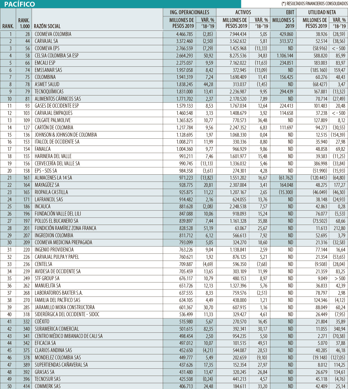 De acuerdo con el informe de la Superintendencia de Sociedades, Coomeva, al igual que en 2018, lidera la lista de las empresas con mayores ingresos en la región Pacífica. La compañía tuvo ventas durante 2019 por $4,54 billones y, a pesar de la caída en este rubro (de 2,85%), la empresa logró mejorar en 28,59% su utilidad, llegando a $38.926 millones.