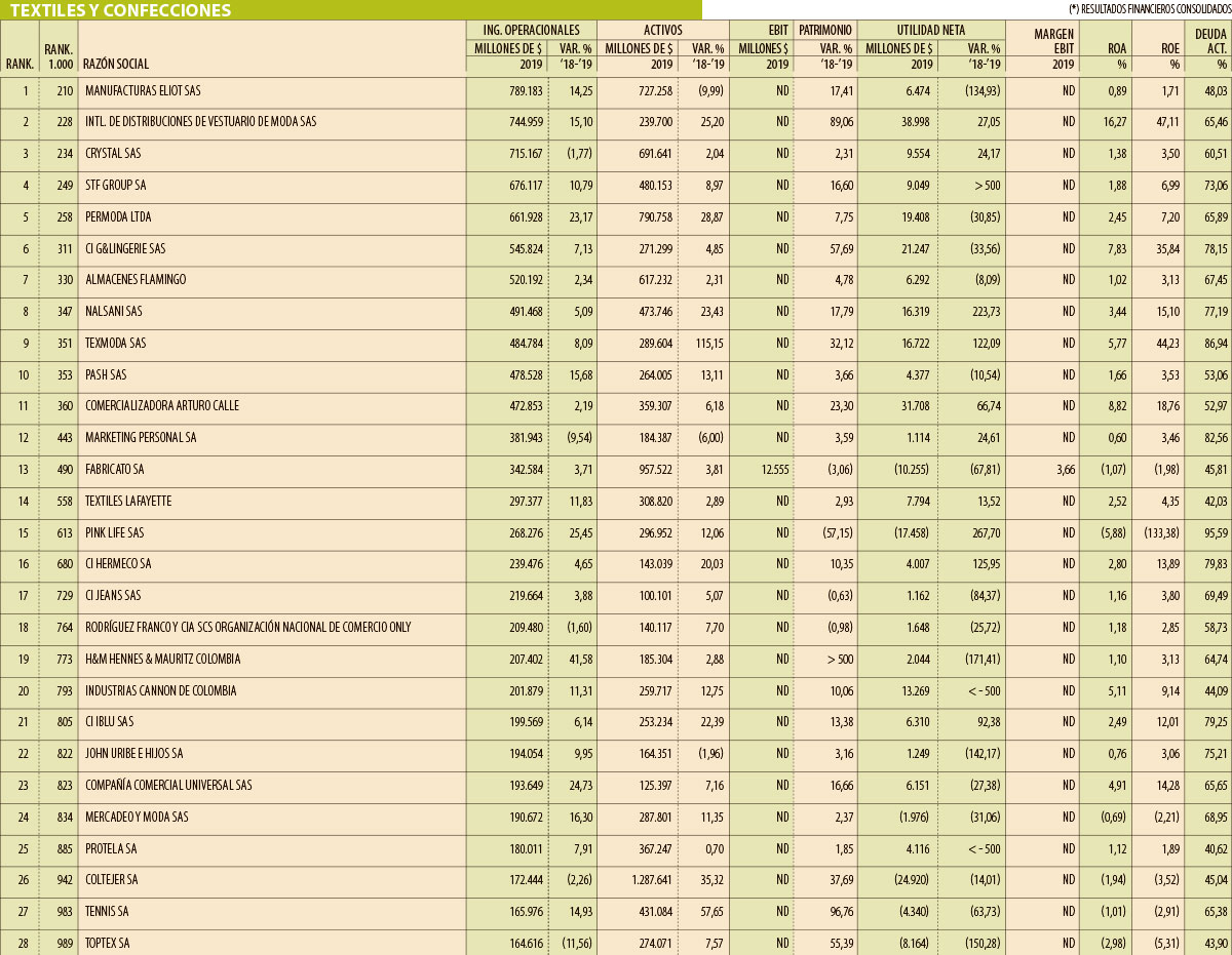De acuerdo con el reporte que presentó la Superintendencia de Sociedades, entre las 1.000 empresas más grandes del país, 28 hacen parte del sector de textiles y confecciones. En total las compañías de esta categoría alcanzaron ingresos operacionales consolidados por $10,41 billones en 2019, lo que significó una recuperación de cerca de $300.000 millones en ventas frente a 2018.