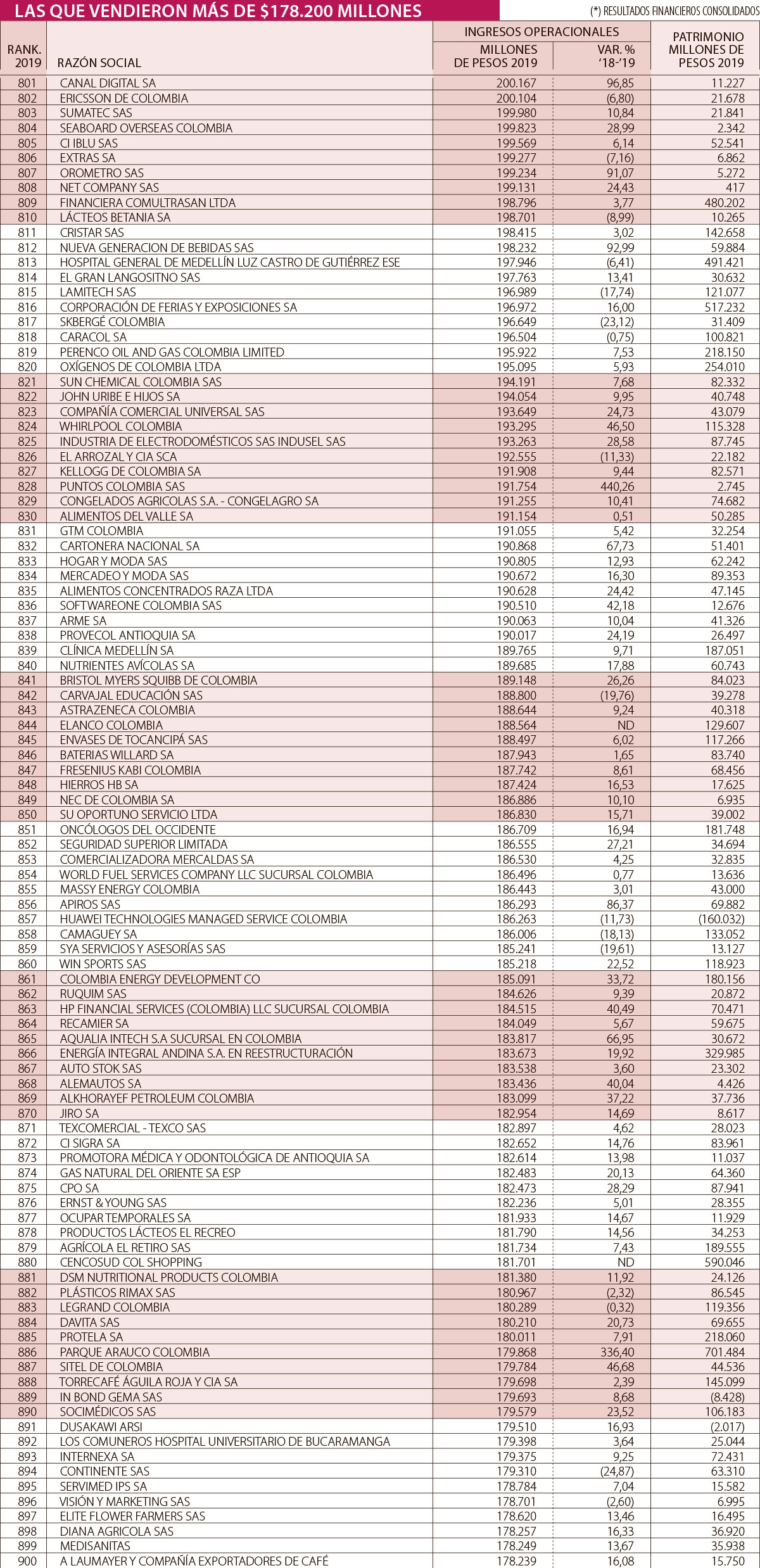 El noveno grupo de las empresas que más vendieron en 2019 (801-900) tiene una particularidad y es el crecimiento de doble dígito que representó en sus balances financieros. En términos totales, estas compañías sumaron ventas por más de $18,7 billones al cierre del año pasado, lo que significó casi 16% más que en 2018, cuando en su momento los ingresos operacionales habían sido por poco más de $16,2 billones.