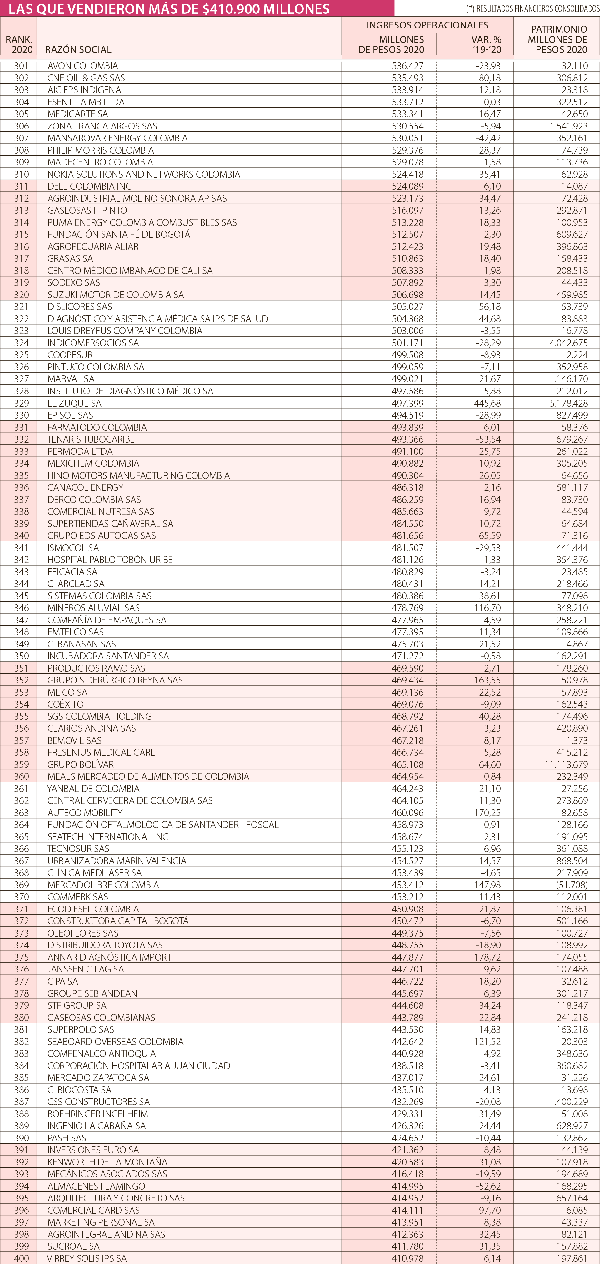 El top cinco lo cierran Cne Oil & Gas SAS con ingresos de $ 535.493 millones; en el puesto 303 está Aic Eps Indígena, al reportar $533.914 millones en 2020; Esenttia Mb Ltda. se ubica en el lugar 304 con $533.712 millones; y en el puesto 305 la empresa paisa Medicarte que registró ingresos por $533.341 millones.