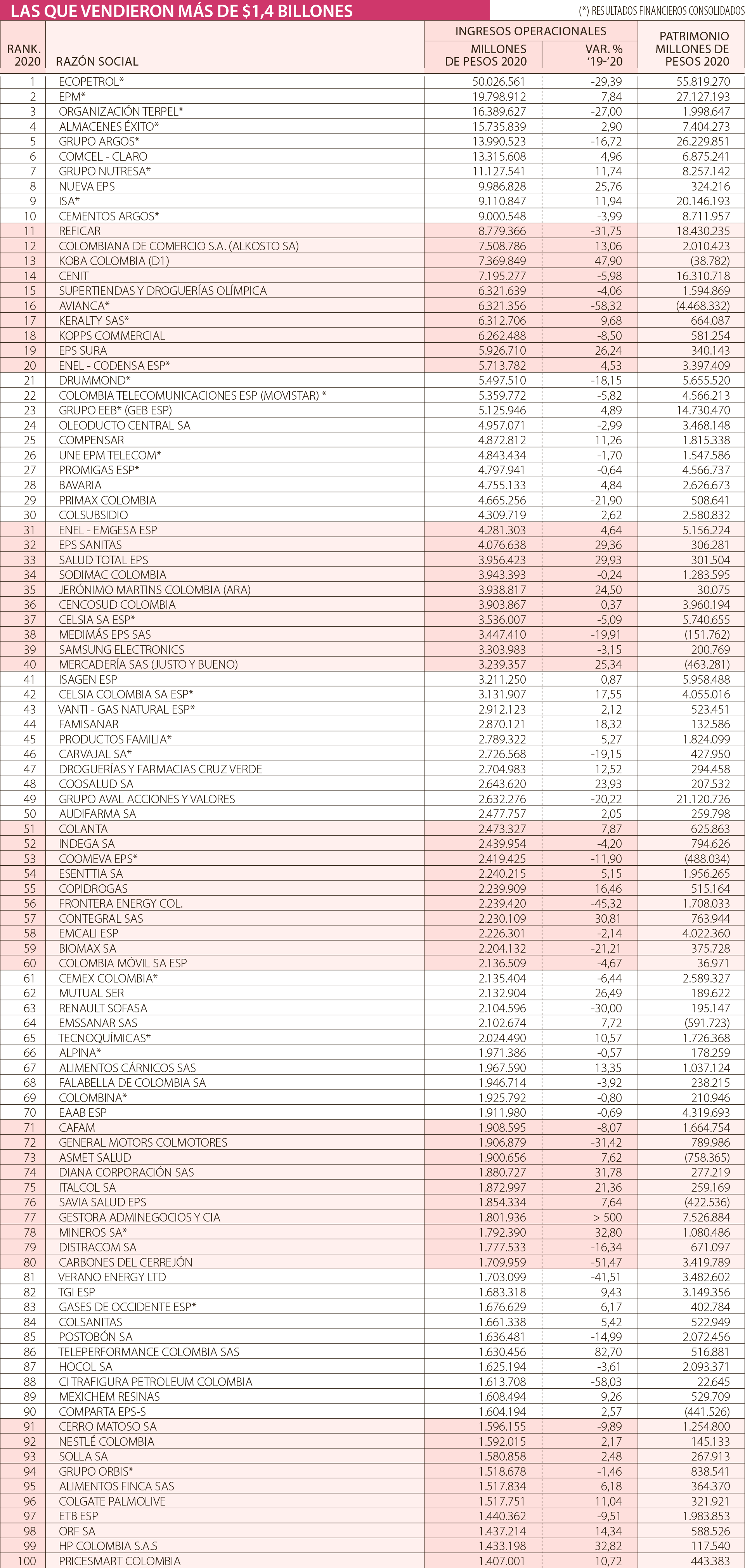 En el último grupo de compañías, de la 901 a la 1.000, se alcanzaron ingresos totales por $16,7 billones, 0,64% menos que en 2019