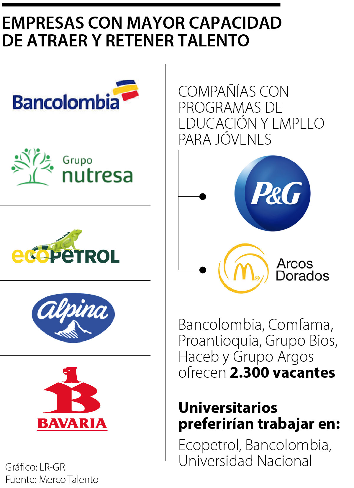 Entre ellas se encuentran Amazon en el puesto 75; Itaú en el lugar 83; y Fundación Santa Fe de Bogotá, en la posición 95. Del mismo modo, en el puesto 96 está Mario Hernández; en el lugar 98, Banco Caja Social; y en la posición 99, Fundación Valle de Lili. Asimismo, las empresas preferidas de los universitarios para trabajar en Colombia son: Ecopetrol, Bancolombia, la Universidad Nacional, Grupo Nutresa y Bavaria, por las relaciones con los mandos inmediatos.