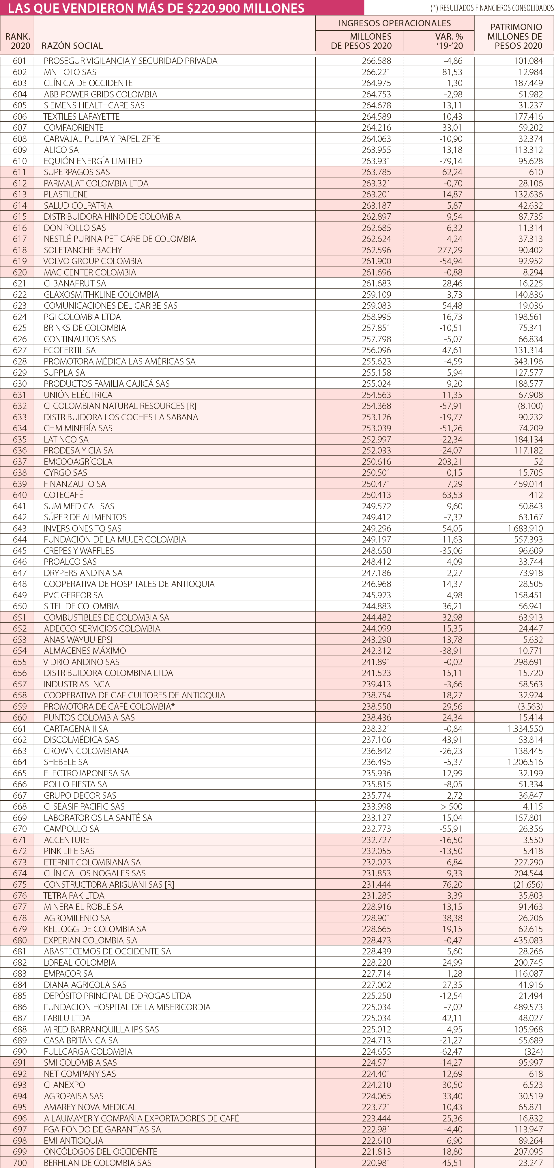 Para entrar en este grupo de empresas se requieren ingresos mínimos de $220.981 millones, que los logró la empresa del Quindío, especializada en productos de aseo y que tuvo un buen 2020, Berhlan de Colombia, que se ubica en la posición 700.
