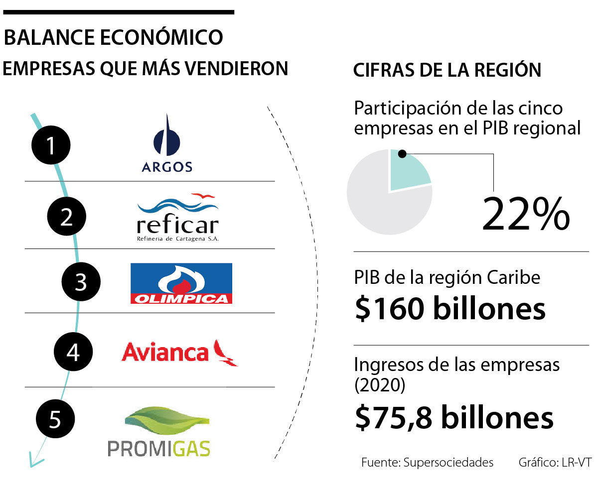 El top cinco de empresas con mejores ingresos en la Costa Atlántica lo complementan Reficar ($8,7 billones), Supertiendas y Droguerías Olímpica ($6,3 billones), Avianca ($6,3 billones) y Promigas ($4,7 billones).