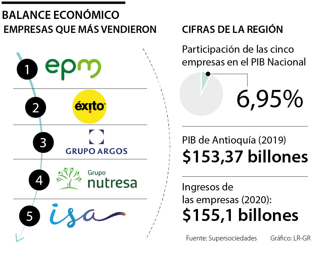 Las cinco más grandes en 2020 fueron, en su orden: EPM, Almacenes Éxito, Grupo Argos, Grupo Nutresa e Isa. El top cinco se mantuvo igual al de 2019, excepto por Éxito y Argos, que intercambiaron su lugar. En su conjunto, estos grupos tuvieron ingresos operativos por $69,76 billones, con lo que su aporte al PIB nacional fue de 6,95%.