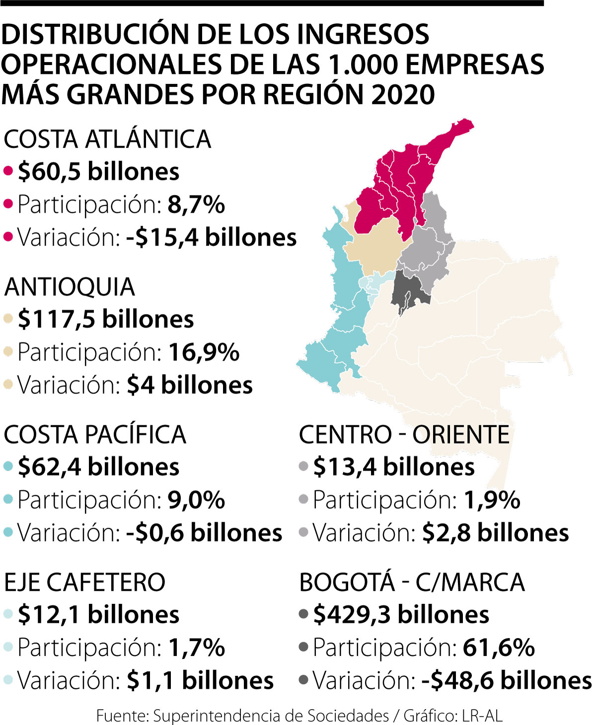 Lo contrario ocurre en la región Central, que ahora tiene uno de los mayores retos en la recuperación, ya que Bogotá, por ejemplo, reúne a varias empresas del sector de servicios, que por no ser esenciales tuvieron que frenar operaciones. Esto generó, según la Supersociedades, que los ingresos en la zona cayeran $48 billones a $429,3 billones; igual manteniendo 61,6% de la participación del total de los ingresos de las 1.000 empresas más grandes en 2020.