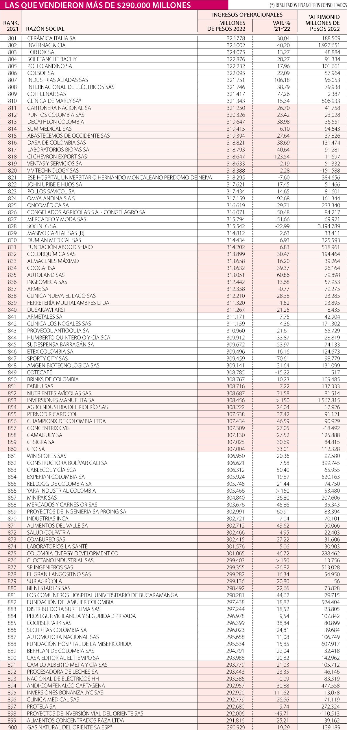 Las compañías que por sus ingresos operacionales durante 2022 lograron un puesto entre las 801 y 899 más vendedoras de Colombia lo hicieron al alcanzar ventas mayores a $290.929 millones, pero inferiores a $326.778 millones. Este grupo es liderado por Cerámica Italia, mientras que el grupo lo cierra Gas Natural del Oriente.