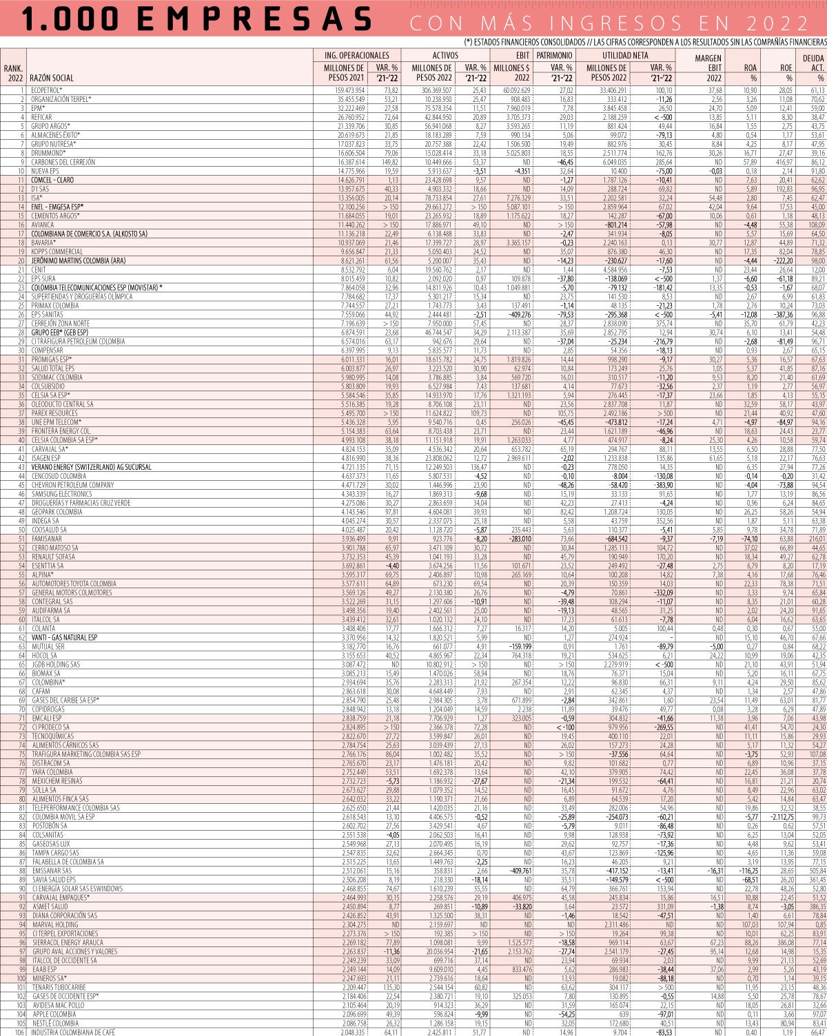 Una vez más hablamos de Ecopetrol, como empresa líder en este listado. La compañía de hidrocarburos sumó $159,4 billones en ingresos operativos, un alza de 73,8% frente a 2021. Al revisar el rubro de activos, la cifra llegó a $306,3 billones con un incremento de 25,4% y la utilidad neta cerró en $33,4 billones.