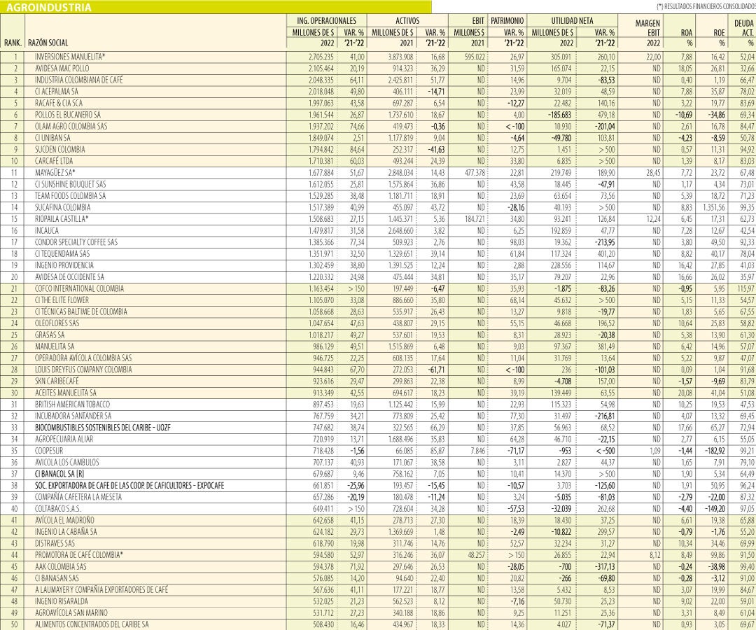 Este año, según el consolidado de la SuperSociedades, Inversiones Manuelita fue la compañía con mayores ingresos, con un registro de $2,7 billones y un crecimiento de 41% respecto a 2021. También tuvo activos por $3,8 billones, lo que le permitió liderar en el sector agropecuario.