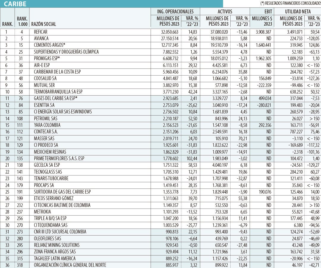 En su orden, la segunda empresa más grande del caribe es Avianca, que el año pasado se ubicó tercera en el mismo ranking. Del macrosector de transporte la empresa, logró para 2023 ingresos operacionales de $27,15 billones, frente a $11,44 billones en 2022, con una variación de 20,56% y ganancias por $224.733 millones.