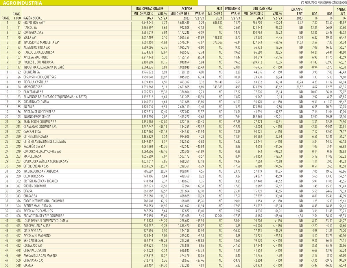 De este ranking, Grupo Bios, se llevó el lugar de la más vendedora dentro del sector agropecuario por segunda vez consecutiva. La compañía agro industrial reportó $6,5 billones en ingresos operacionales durante 2023, con un alza de 7,7% frente a 2022. Las ganancias cerraron en $265.703 millones, 10% menos que el periodo anterior registrado.