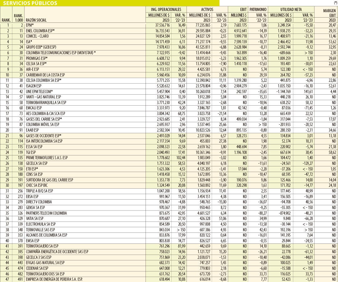 Del lado de las empresas que repuntaron por ganancias, EPM aparece nuevamente en el primer lugar con un beneficio neto de $3,2 billones, luego sigue el Grupo Energía Bogotá con $2,5 billones y en tercer puesto ISA gracias a sus más de $2,4 billones. El club del billón, tiene a Enel con más de $1,9 billones, mientras que Claro, que lideró en telecomunicaciones, reportó ganancias por más de $1,4 billones.