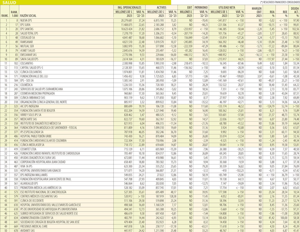 Al continuar con el análisis del ranking, en el segundo lugar quedó la EPS Sura, que tuvo ingresos por $11,4 billones, también con un alza de 22,6%. Sin embargo, el desempeño no fue lo suficientemente bueno como para no dar pérdidas por $221.506 millones, al punto de que este año tuvo que solicitarle al Gobierno su retiro del sistema.