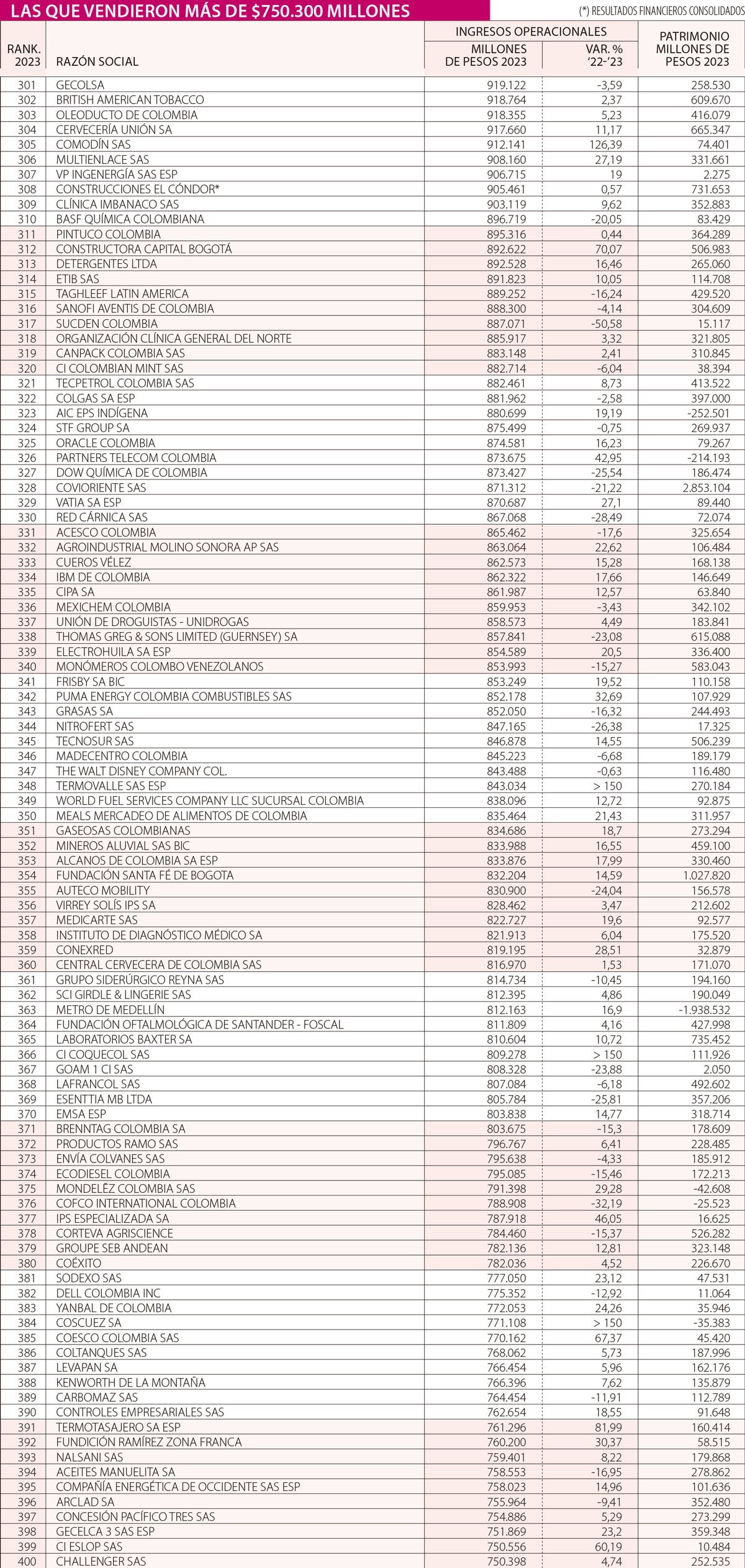 En cuanto a ganancias, este club de organizaciones cayó. Durante 2023, las 100 empresas que se ubicaron entre el puesto 301 y 400, disminuyeron sus ganancias más de 20%, con una cifra total de $3,5 billones.