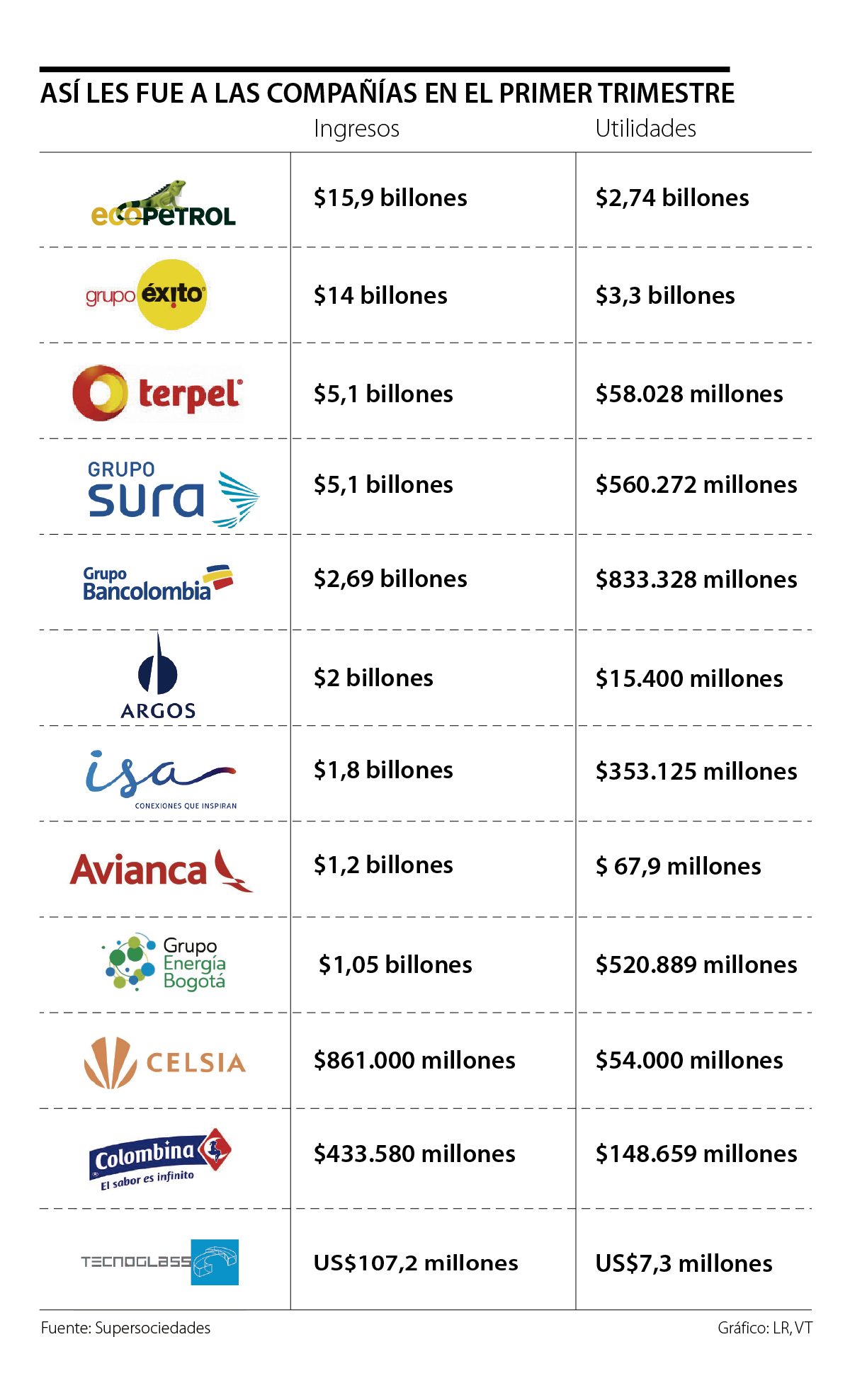 Ecopetrol se llevó el liderato en ingresos. La compañía reportó que sus ventas durante el primer trimestre fueron de $15,9 billones, con un aumento de 8,9%.