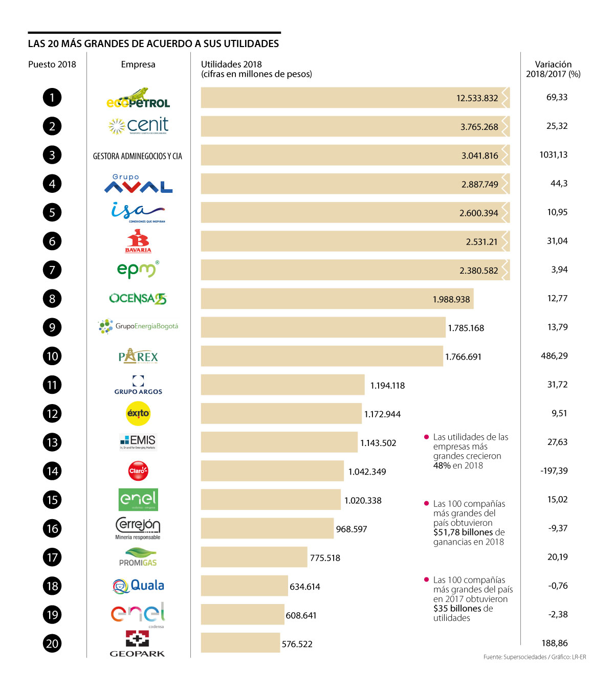 Las empresas que más obtuvieron ganancias el año pasado fueron Ecopetrol, con $12,53 billones; Cenit, con $3,7 billones; y Gestora Adminegocios, con $3 billones