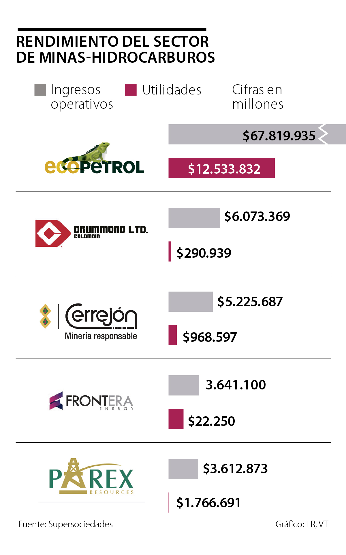 Dentro del sector minero y de hidrocarburos, la compañía estatal Ecopetrol fue la que punteó como la de mayor cantidad de ingresos en 2018, con $67,81 billones y una utilidad neta de $12,53 billones. Tras la petrolera se ubicó Drummond, con ventas por $6,07 billones y una utilidad neta de $290.939 millones. Carbones del Cerrejón llegó a la tercera posición del sector minero, tras registrar el año pasado ingresos por $5,22 billones por sus ventas totales, en cuanto a las ganancias la compañía reportó $968.597 millones de utilidad. Frontera Energy Colombia (antes Pacific) se ubicó en la lista como la cuarta empresa dedicada a actividades de minas e hidrocarburos, tras reportar ingresos operacionales por $3,64 billones y $22.250 millones en ganancias. Parex Resources se ubicó en la quinta posición del listado del sector minero, gracias a sus $3,61 billones en ventas, mientras que el grupo de origen canadiense reportó $1,76 billones en utilidades.