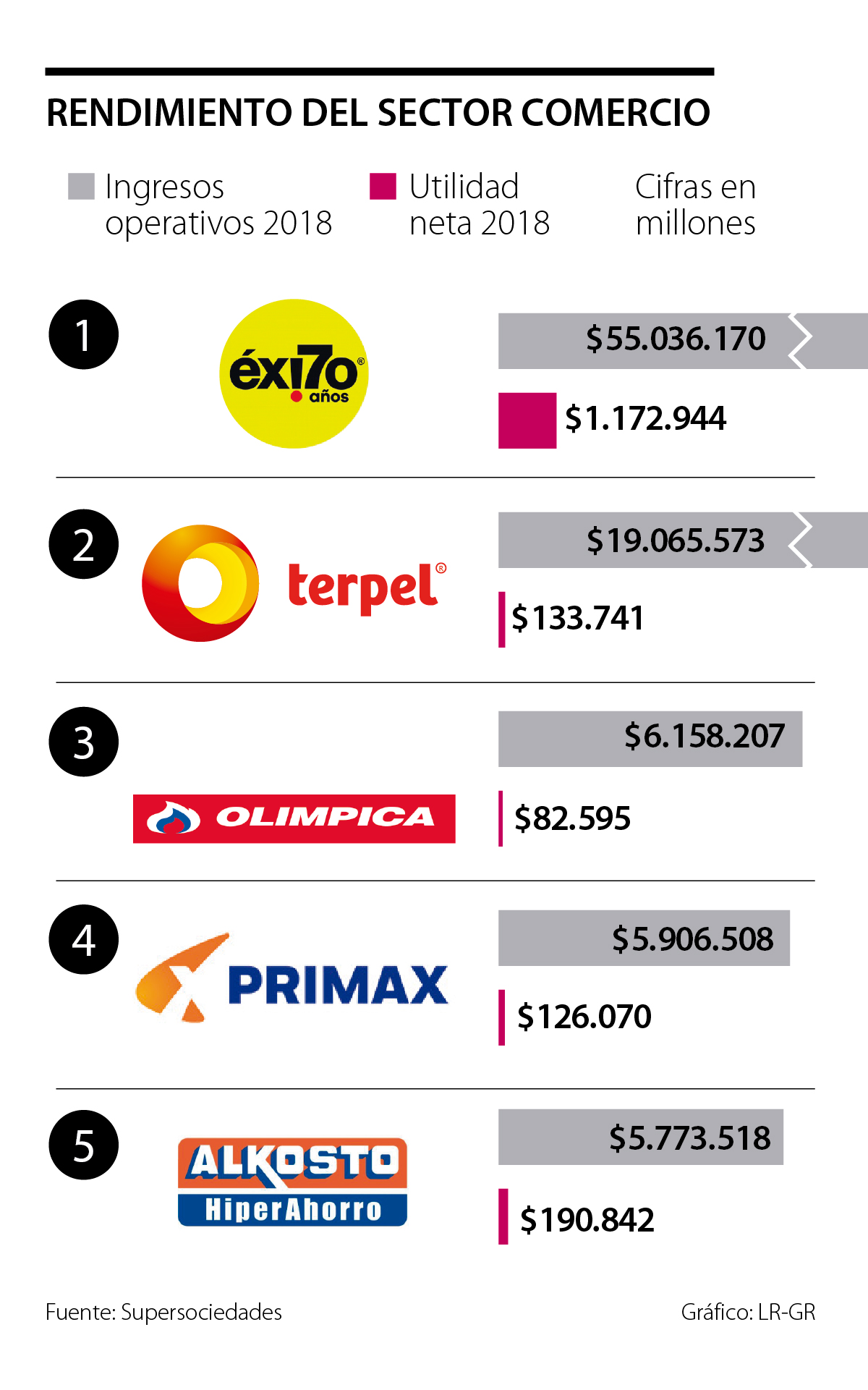 Dentro del sector comercio nuevamente Almacenes Éxito se posiciona como la líder del mercado, tras lograr $55,03 billones en ventas durante 2018. La cadena de almacenes destacó que esto significó un incremento de 8,9% por encima del año anterior. En cuanto a las utilidades, la compañía registró $1,72 billones. La segunda empresa del sector fue la Organización Terpel, que reportó ventas en 2018 por $19,06 billones y ganancias de $133.741 millones. En cuanto a Olímpica S.A., las ventas totales de la cadena de supermercados barranquillera llegaron a $6,15 billones el año pasado, mientras que las utilidades fueron $82.595 millones. Primax Colombia, que compró la operación de ExxonMobil, por otro lado, reportó el año pasado ingresos operacionales por $5,9 billones, con lo que se ubicó como la cuarta empresa del sector comercio, y logró utilidades por $126.070 millones. Finalmente, Colombiana de Comercio S.A. (Alkosto), cerró el top 5 con ventas por $5,77 billones y $190.842 millones en ganancias.