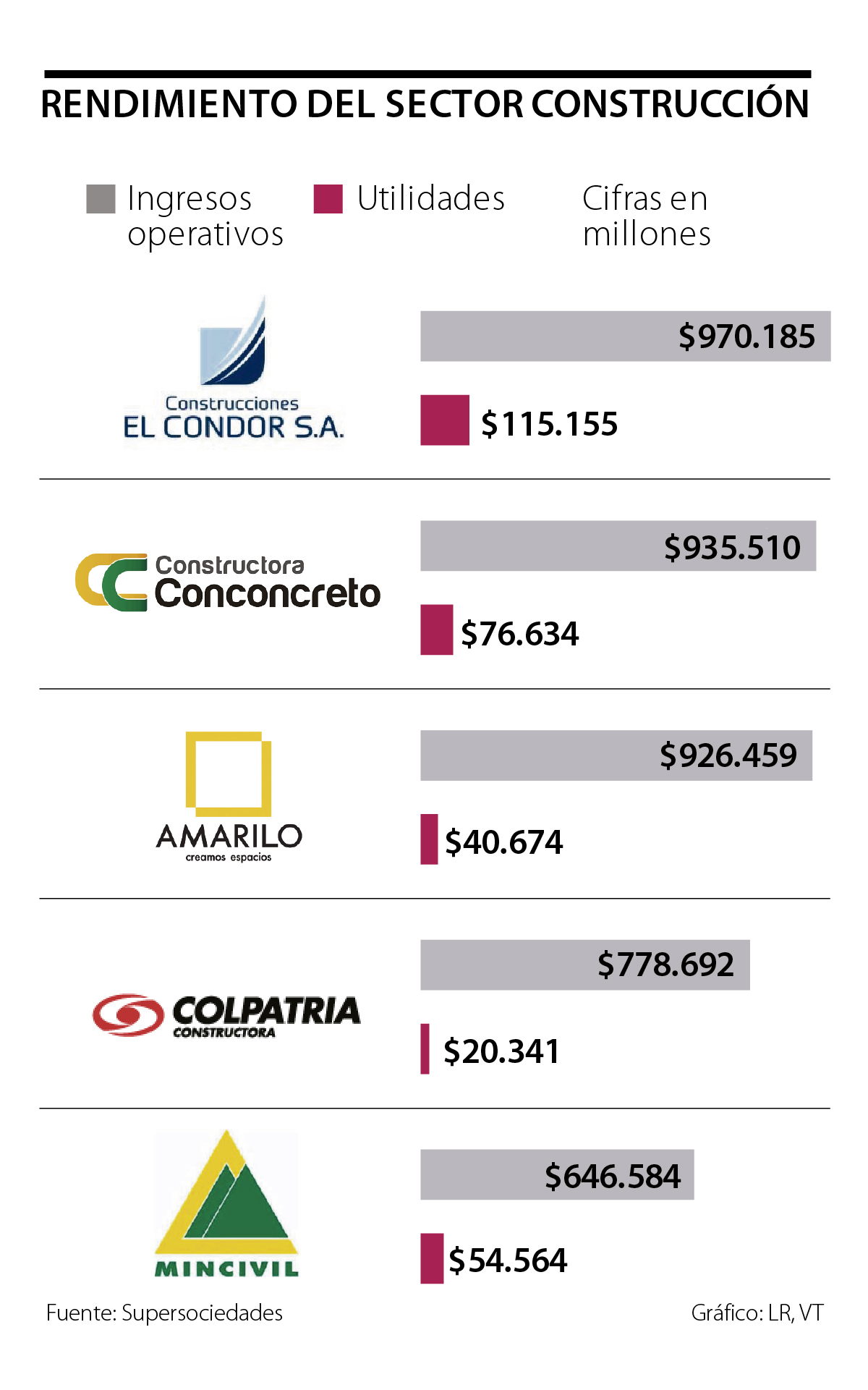 Si bien ninguna compañía logró ubicarse entre las 100 primeras, en el sector de construcción la empresa con más ingresos en 2018 fue Construcciones el Cóndor, con $970.185 millones de ingresos operacionales y una utilidad de $115.155 millones, que frente a las ganancias de 2017 ($184.908 millones) disminuyó en 37,72%. La segunda empresa del sector, Constructora Conconcreto S.A., reportó ventas por $935.510 millones y utilidades por $76.634 millones para 2018, mientras que los $926.459 millones en ventas llevaron a Amarilo S.A. a ocupar el tercer lugar entre las empresas que más vendieron en la construcción en 2018. La constructora reportó utilidades por $40.674 millones, 12,9% más altas a las ganancias de 2017 que fueron $36.024 millones. La cuarta empresa del sector fue Constructora Colpatria S.A., que logró $778.692 millones en ingresos y $20.341 millones en utilidades. Finalmente, Mincivil S.A. reportó ventas por $646.584 millones y ganancias de $54.564 millones.