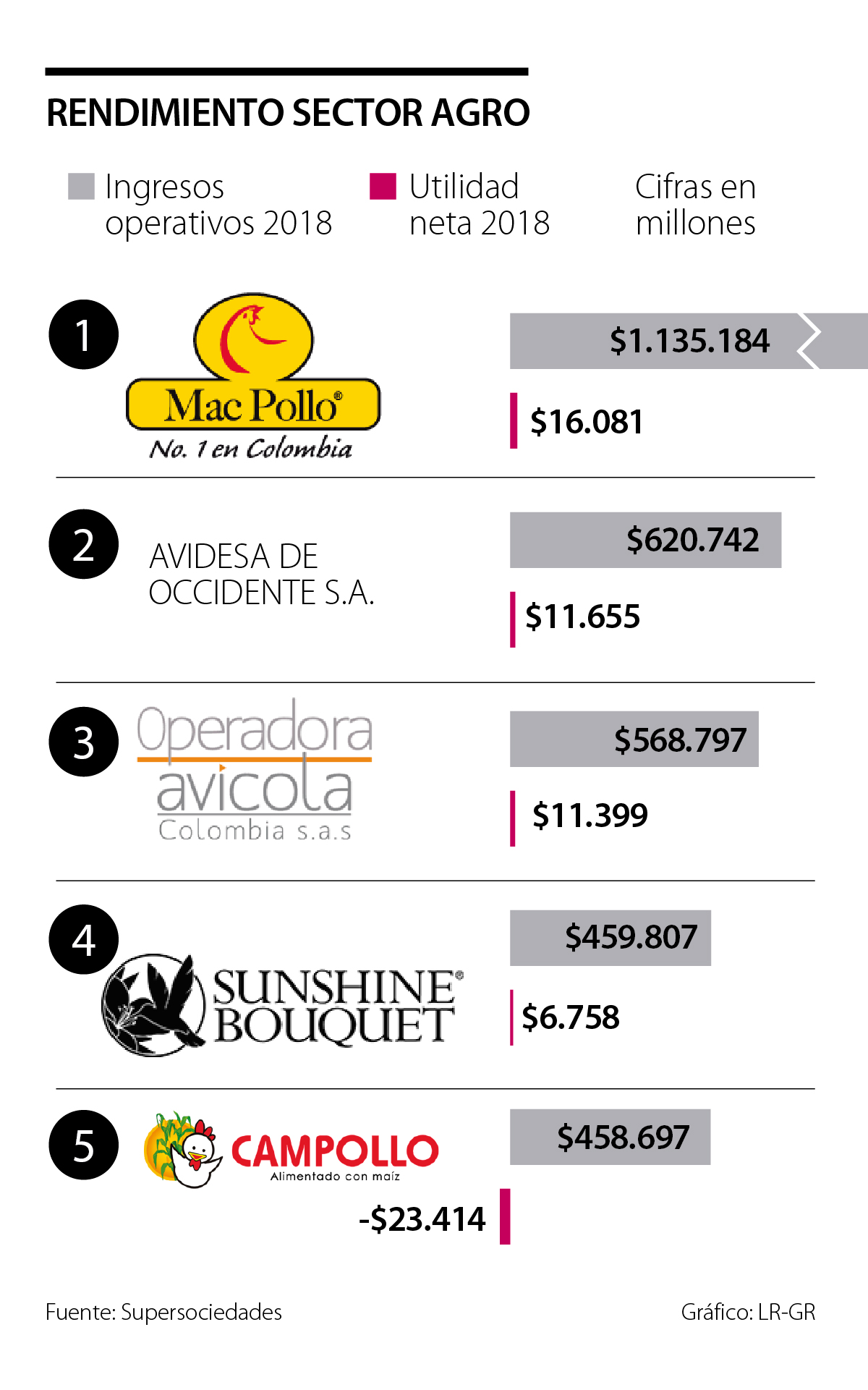 Entre las empresas de este macrosector, ninguna alcanzó el top 100. Sin embargo, dentro de las empresas del sector, la de mayores ventas en 2018 de las 1.000 fue Avidesa Mac Pollo S.A., que registró $1,13 billones en ingresos operacionales para ese periodo, un incremento de 8,71% frente a sus ventas de 2017, que fueron $1,04 billones. La empresa reportó así mismo una utilidad de $16.081 millones para 2018. La segunda compañía en el sector es Avidesa de Occidente S.A., sociedad que reportó ingresos por $620.742 millones y una utilidad de $11.655 millones el año pasado. La tercera gran compañía del sector agropecuario es Operadora Avícola Colombia S.A.S., que registró $568.797 millones en ingresos y una utilidad de $11.399 millones. En la cuarta posición está C.I. Sunshine Bouquet S.A.S, que reportó $459.807 millones en ingresos y ganancias por $6.758 millones. Finalmente, la última compañía en el Top 5 del agro en 2018 fue Campollo S.A., con ingresos operacionales de $458.697 millones y $23.414 millones en pérdidas.