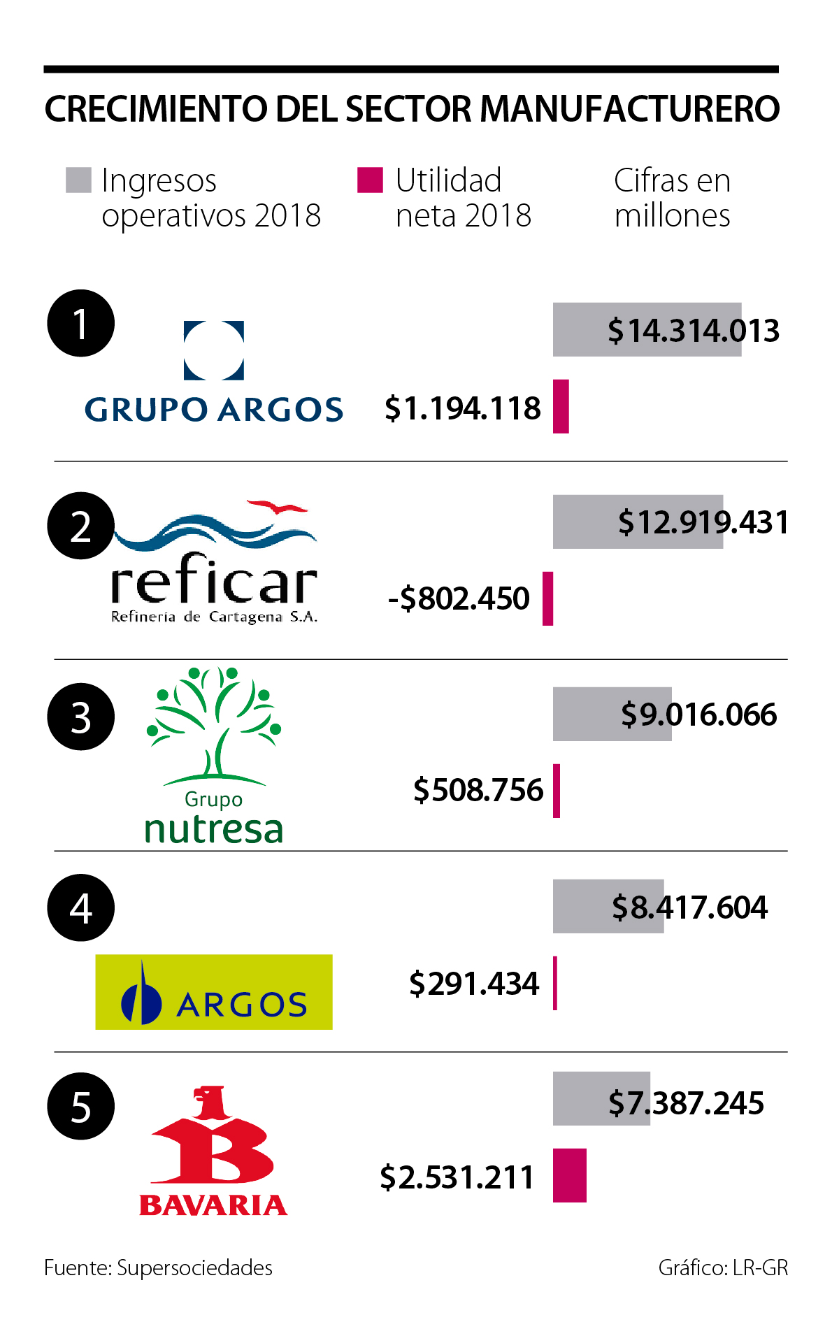 La industria en 2018 se vio especialmente impulsada por los resultados del Grupo Argos, que entregó un balance de $14,31 billones en sus ventas operacionales, acompañado de $1,19 billones en ganancias. La segunda compañía industria en la lista de las 100 más grandes de 2018 fue la Refinería de Cartagena, Reficar, que si bien logró ingresos operacionales por $19,91 billones, reportó pérdidas por $802.450 millones. El Grupo Nutresa se ubicó en la tercera posición de la lista, con $9,01 billones en ventas y ganancias por $508.756 millones, con lo cual superó a Cementos Argos, que llegó a ubicarse como la cuarta empresa del sector industrial con mayores ventas en 2018 gracias a su resultado de $8,41 billones, producto de la baja en la construcción, que hizo caer las ventas de cemento. No obstante, la cementera consolidó utilidades por $291.434 millones. En la quinta posición del sector se ubicó Bavaria, con $7,38 billones en ventas para 2018 y ganancias por $2,53 billones.