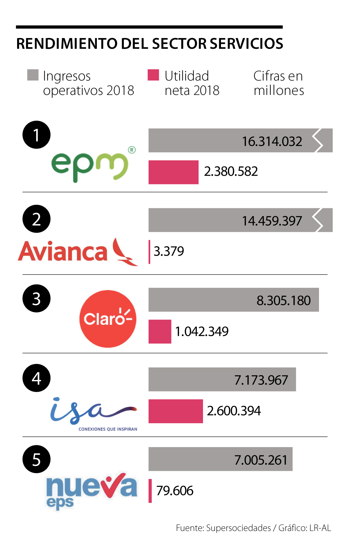Dentro de las empresas dedicadas a actividades relacionadas con los servicios, Empresas Públicas de Medellín (EPM) continúa en la cabeza del sector, con $16,31 billones, y ganancias por $2,38 billones. La compañía que se estableció en el segundo lugar del listado fue Avianca. La empresa que estuvo al mando de Hernán Rincón durante dicho periodo, sostuvo ingresos de más de $14,45 billones, este punto, a pesar de las utilidades por $3.379 millones, la posicionó en el segundo lugar. Por su parte, por medio de su razón social Comcel, Claro Colombia fue la tercera compañía de mayores ingresos con $8,3 billones. En total, las ganancias de esta firma fueron de $1,04 billones. ISA, presidida por Bernardo Vargas, fue la firma que se posicionó en la cuarta casilla, tras contabilizar ingresos de $7,17 billones, lo que sirvió para dar una ganancia de $2,6 billones. La quinta empresa de servicios de mayor movilización de ingresos corresponde al segmento de salud, ya que Nueva EPS ingresó $7 billones.